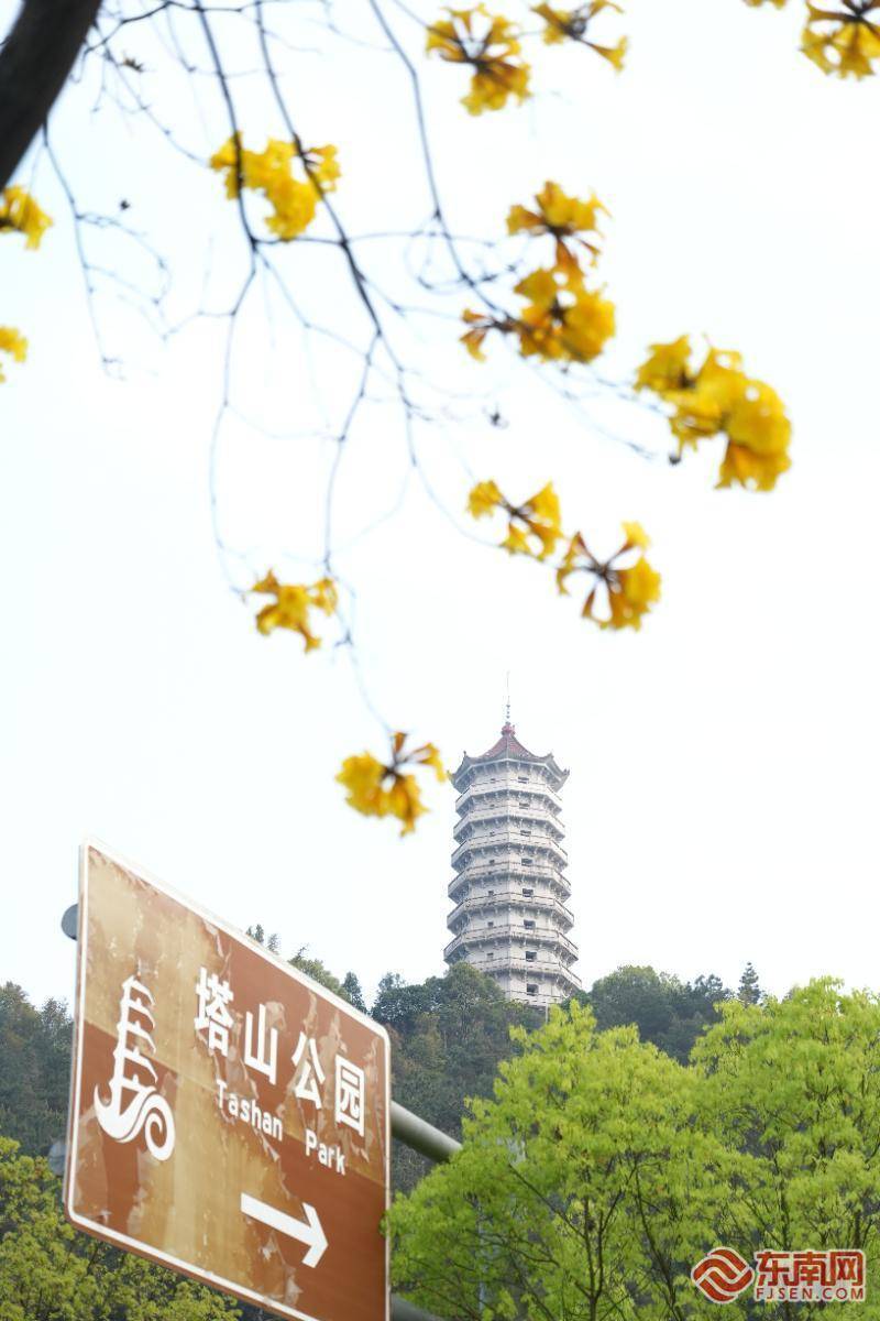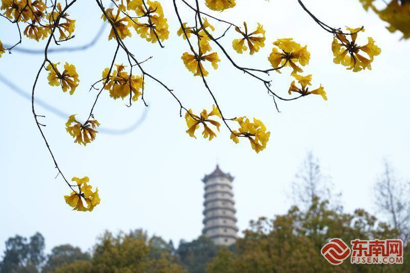 黄花风铃木与塔猴子园。东南网记者 潘月容 摄