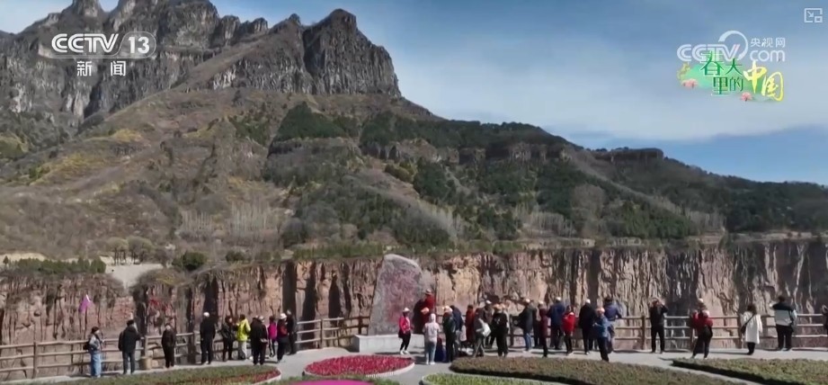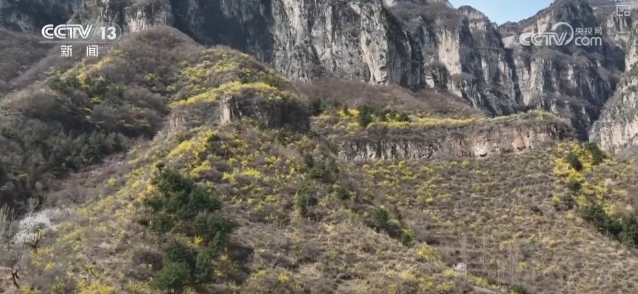 r春光适值,在河南新乡的南太行山,漫天匝地的野生连翘花竞相通达,招引不少旅客共赴春日之约。