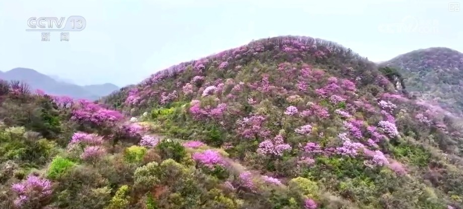 r这两天,在湖北宜齐市的群山深处,一派绵延3000多亩的野生巨紫荆群落花开正艳。放眼望去,遍及的粉紫色如同泼洒的心绪,浸染在山峦上,微风拂过,花海泛起紫色动荡。