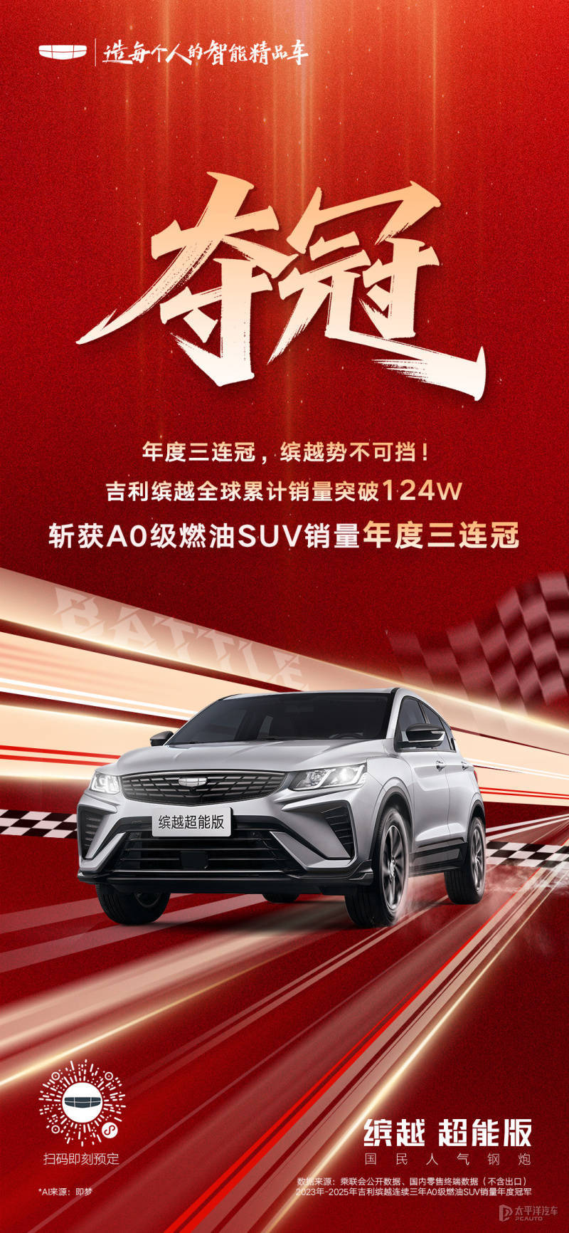 【太平洋汽车 汽车动态】1月12日,祥瑞汽车本日发布销量战报,旗下缤越系列A0级燃油SUV大家累计销量打破124万开yun体育网,同期斩获A0级燃油SUV销量年度三连冠。