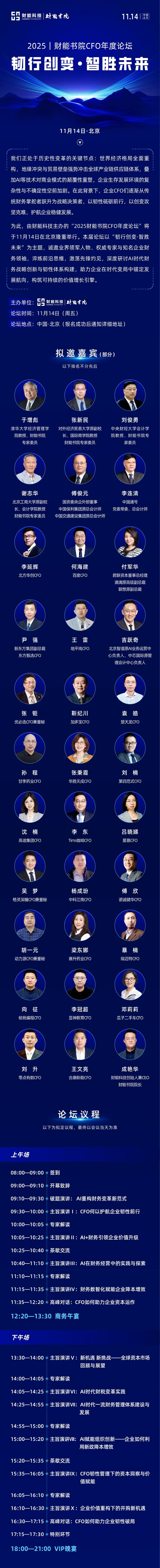 为此,由财能科技控制的“2025财能书院CFO年度论坛”将于11月14日在北京无际举行。本届论坛以“韧行创变·智胜改日”为主题,诚邀业界领军东说念主物、巨擘群众与驰名企业财务魁首,淬真金不怕火前沿念念维,踯躅前卫灼见,深度酌量AI时期财务政策鼎新与韧性体系构建,助力企业在时期变局中锚定发展航向,构筑可抓续的价值增长引擎。