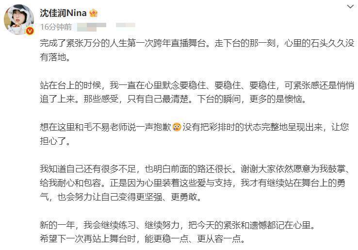 沈佳润的谈歉信展现了专科作风和服务感。她莫得侧目诞妄,安适承认“莫得把彩排时的景况无缺呈现出来”,并详备描述了舞台上的着实感受。