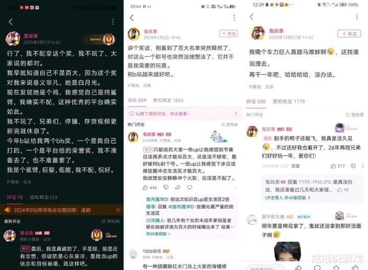 一切的导火索,是1月12日阿谁名为《年度最好米游授奖会》的直播切片视频。在这场直播中,鬼叔黍和另两位主播用一种戏谑、反讽的样式对米哈游旗下的游戏进行了另类“授奖”。直播切片视频发布后,B站平台很快给视频打上了“视频不雅点包含引战内容,请感性判断”的象征。紧接着,更严厉的惩处来了。鬼叔黍的B站账号主页清晰:“该账号波及传播空虚误导信息已被封禁”。凭证鬼叔黍本东谈主在贴吧的爆料,此次封禁与米哈游方面径直有关,他以至还一度濒临被告状的风险。流程一番交流,封禁时长从当先的7天裁减到了2天。这一波操作,径直把事件奉上了贴吧热搜,让鬼叔黍从一个游戏区UP主,倏得成了全站瞩打算“抗压焦点”。