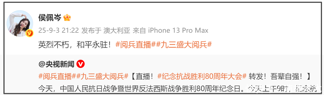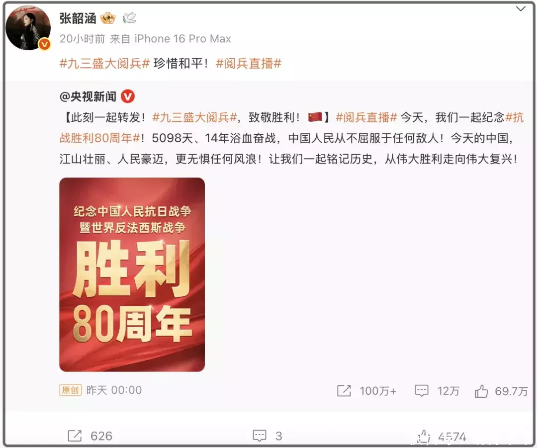但越拿以前说事,越讲明当今啥王人莫得。抗战告捷80周年如斯阻碍的事情,每一个中华儿女王人应感到骄矜自傲,尤其是欧阳娜娜、张韶涵、侯佩岑等被“监视”的台湾省艺东说念主转发动态硬刚,明确抒发我方态度,不惧阻扰,他们王人能作念获取,跋扈在内地开演唱会捞金的蔡依林为何不成?