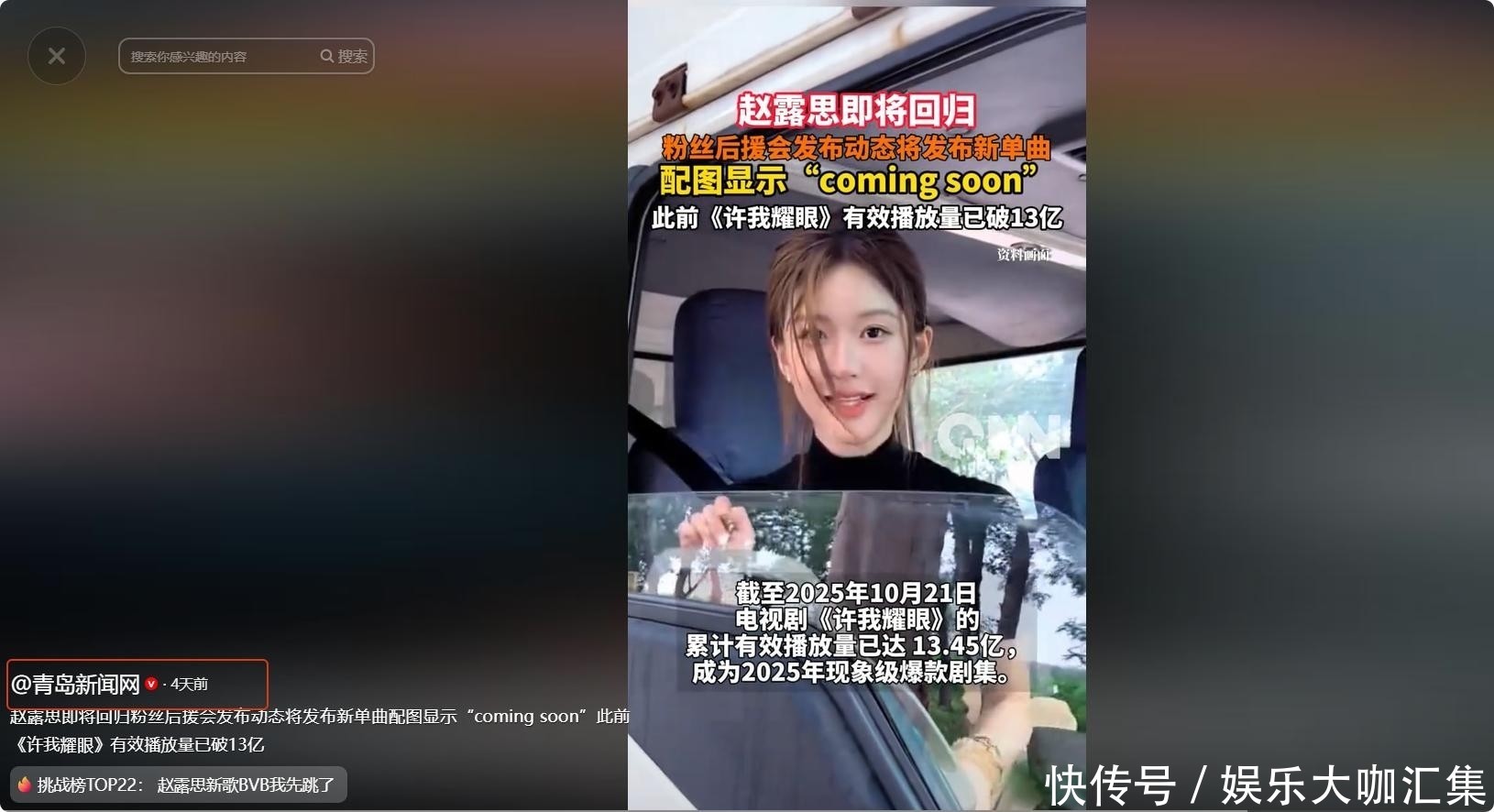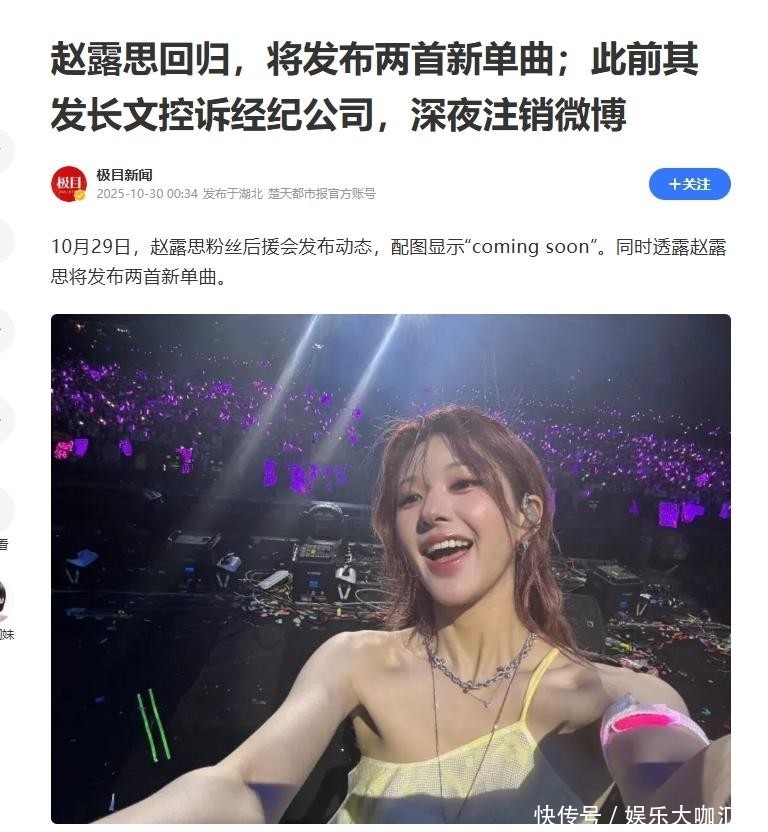 10月29日,赵露念念官方粉丝后盾会发布动态,配图接管“coming soon”作风想象。