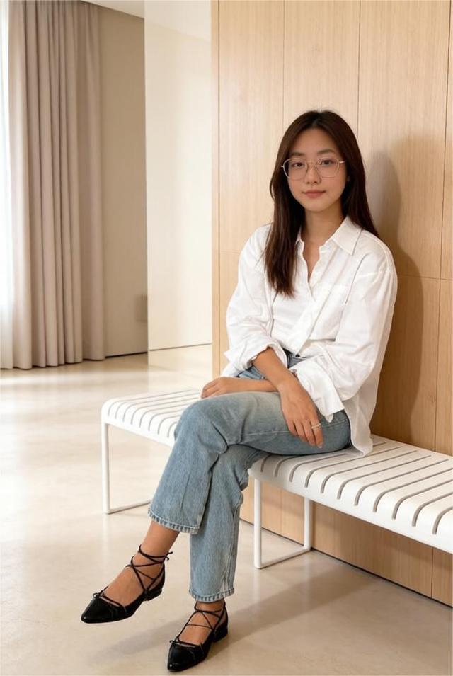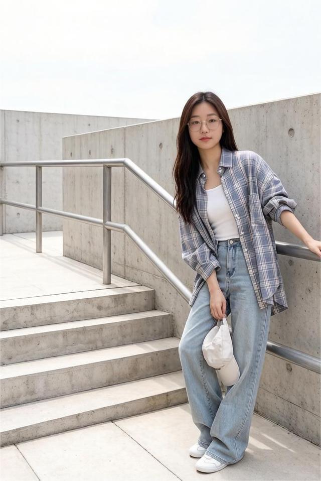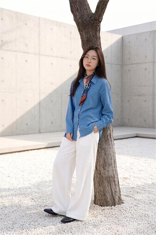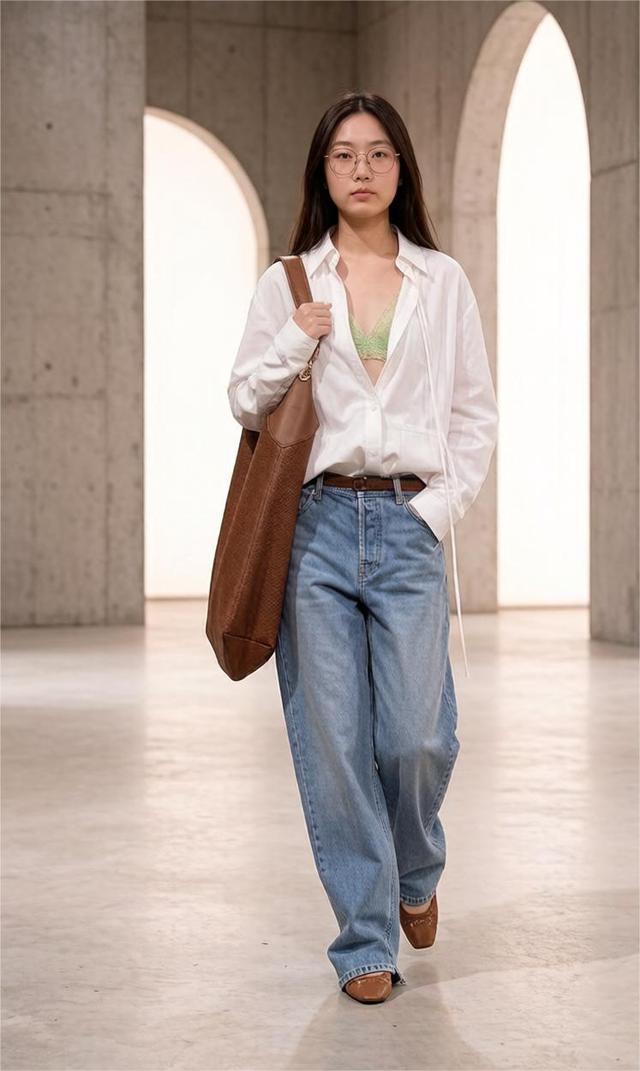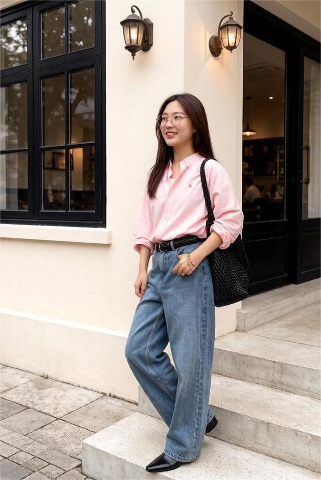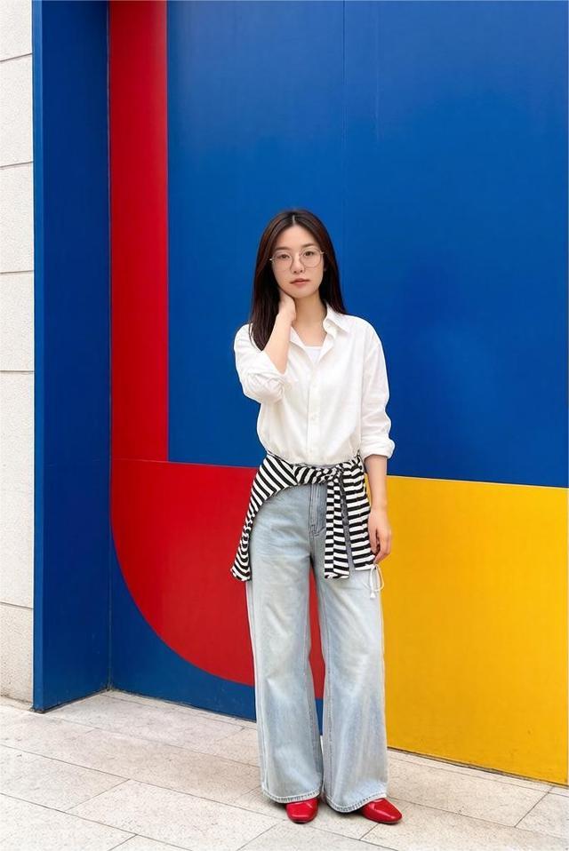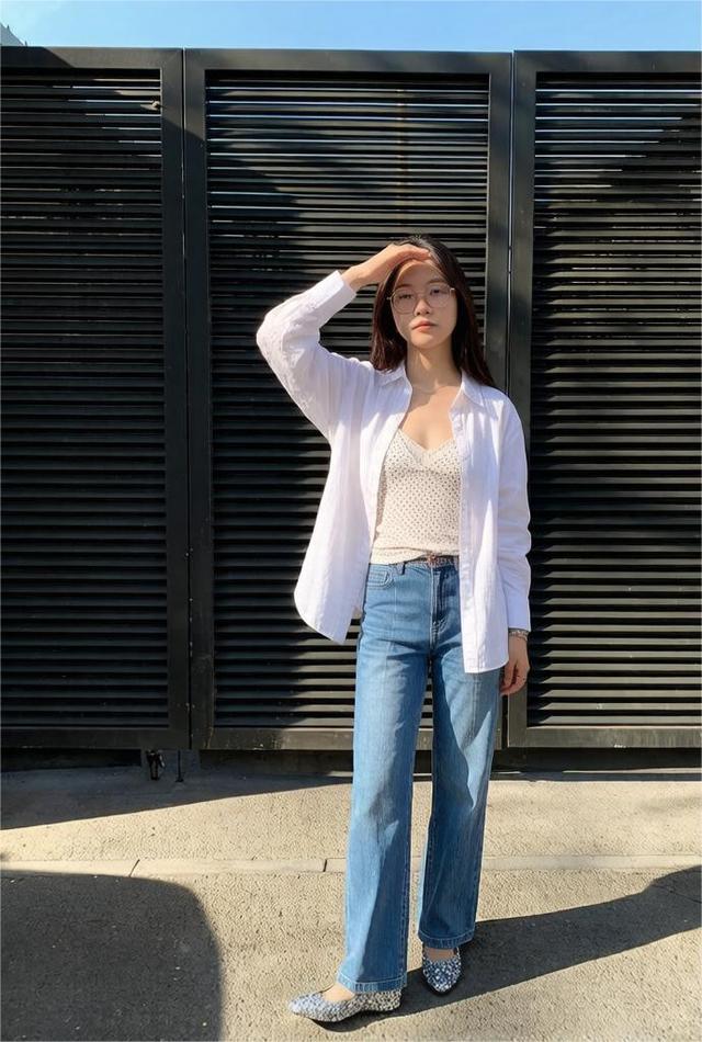 衬衫当外衣时搭配的牛仔裤颜料有许多,初次尝试衬衫配牛仔裤的姐妹,不错像博主相似遴荐纯白色衬衫搭配水洗蓝牛仔裤,简便澄莹。