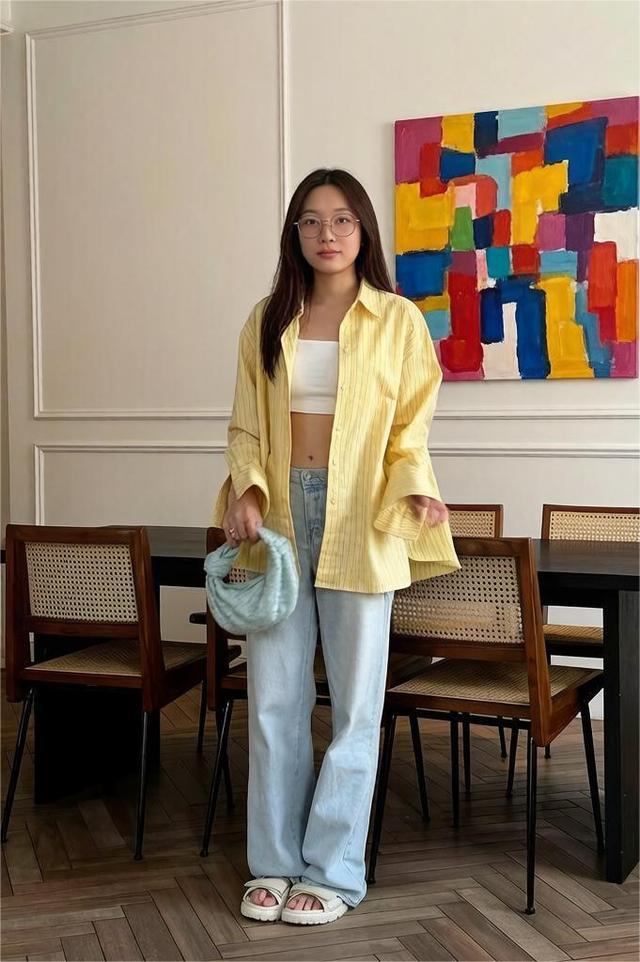 对有小肚腩的姐妹来说, 遴荐衬衫不系扣穿法更宽心,诓骗衣摆遮住小肚腩,安全又耐看,对没小肚腩的姐妹来说,遴荐系扣外加塞衣角穿法时,不错增高显瘦。