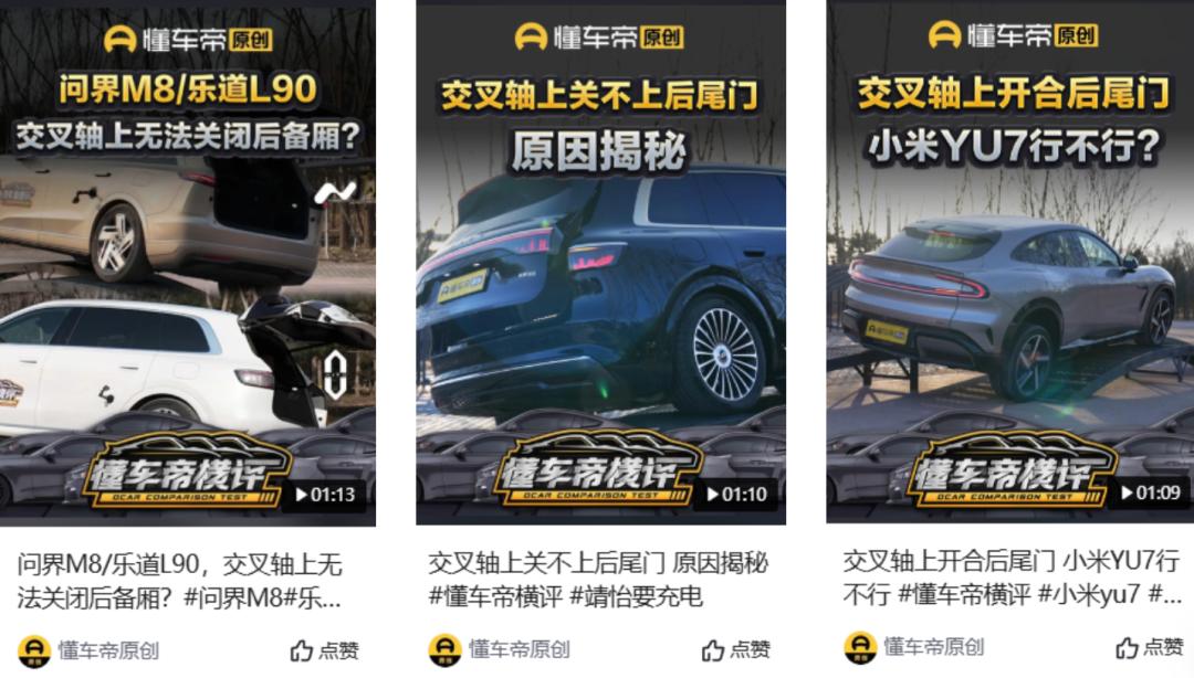 事情的启事,是两天前懂车帝在我方的原创频说念里发了这样几期测试的视频。他们把当今很火的几台新动力 SUV 都开到了交叉轴上,然后在车身静止的景象下看它们的车门或者后备厢能不可平淡关闭。